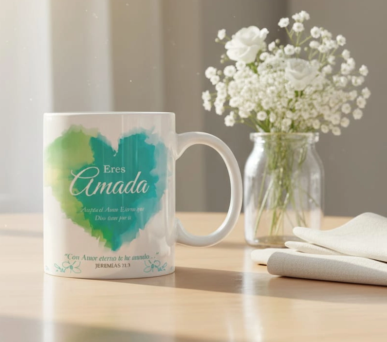 Start your day reminded of God’s eternal love. The “Eres Amada” mug features a soft watercolor heart design in serene shades of teal and green, paired with the comforting words from Jeremías 31:3: